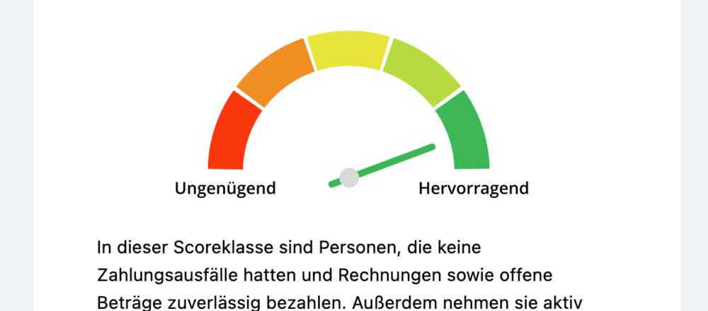 Abgefragt wird etwa, wie alt das älteste Girokonto ist, wie viele Kreditkarten jemand besitzt, wie viele Ratenkredite laufen, ob man einen Immobilienkredit bedient, online auf Rechnung gekauft hat oder umgezogen ist. Es gibt auch eine Abfrage zu Zahlungsausfällen. Dann berechnet der Simulator ein Ergebnis zwischen „ungenügend“ in rot und „hervorragend“ in grün. Die Wahrscheinlichkeit, dass ein Kredit zurückgezahlt wird, beträgt dann mehr als 97,21 Prozent. Oder umgekehrt: Das Ausfallrisiko ist geringer als 2,79 Prozent.